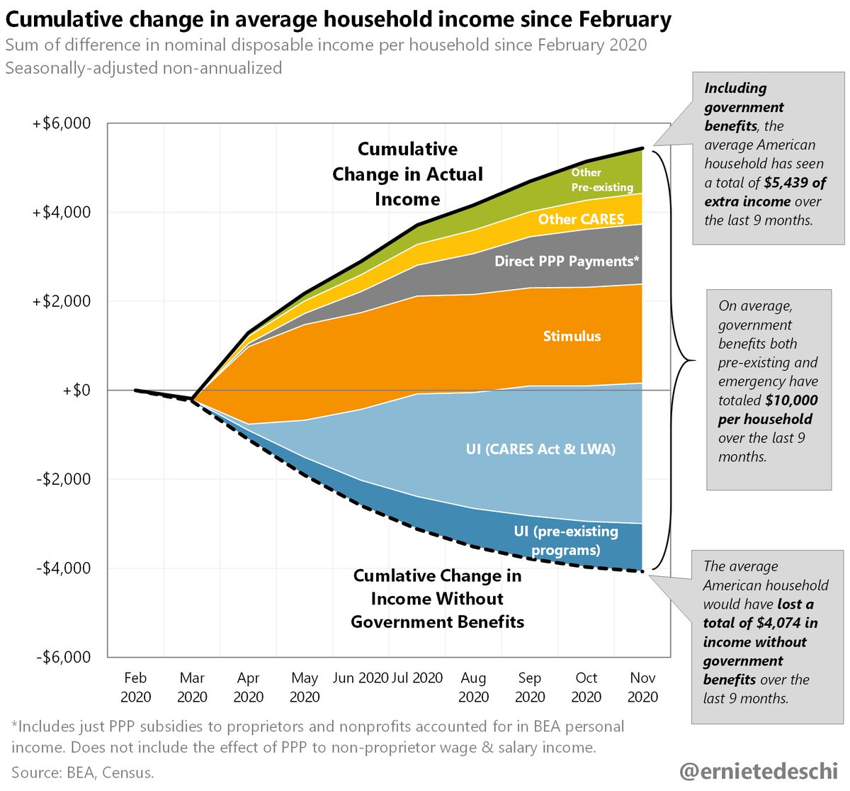 Breaking down the effect of government benefits on average household income over the past 9 months. Or, It Wasn't Just A $1,200 Check, Chart Edition pic.twitter.com/EKKnCryW5M