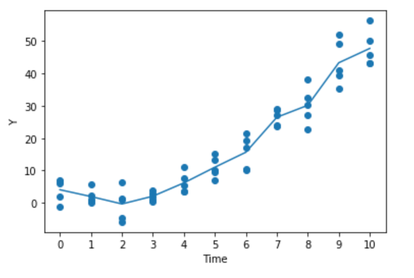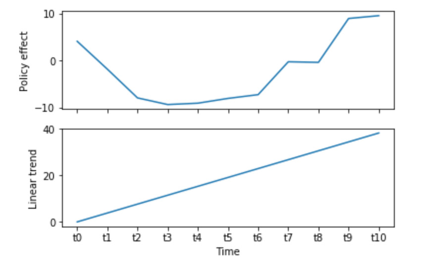 Because I'm extremely pissed off, I used the methodology of the Doleac paper about the opioid epidemic to build a causal model of the process Y = 0.5*(time)^2 + noise to estimate time-specific effects while controlling for a linear trend pic.twitter.com/19m7UmAMa7