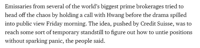 Wow! Great read from @sridinats and @DonalGriffin1 on how the major banks held a call with each other in the middle of last week to try to do an orderly unwind of Hwang's position, but the talks collapsed and anarchy ensued with Nomura/CS holding the bag https://www.bloomberg.com/news/articles/2021-03-29/bank-bickering-devolved-into-mad-dash-to-unload-archegos-stocks?srnd=premium&sref=vuYGislZ … pic.twitter.com/VaQw9JZwdv