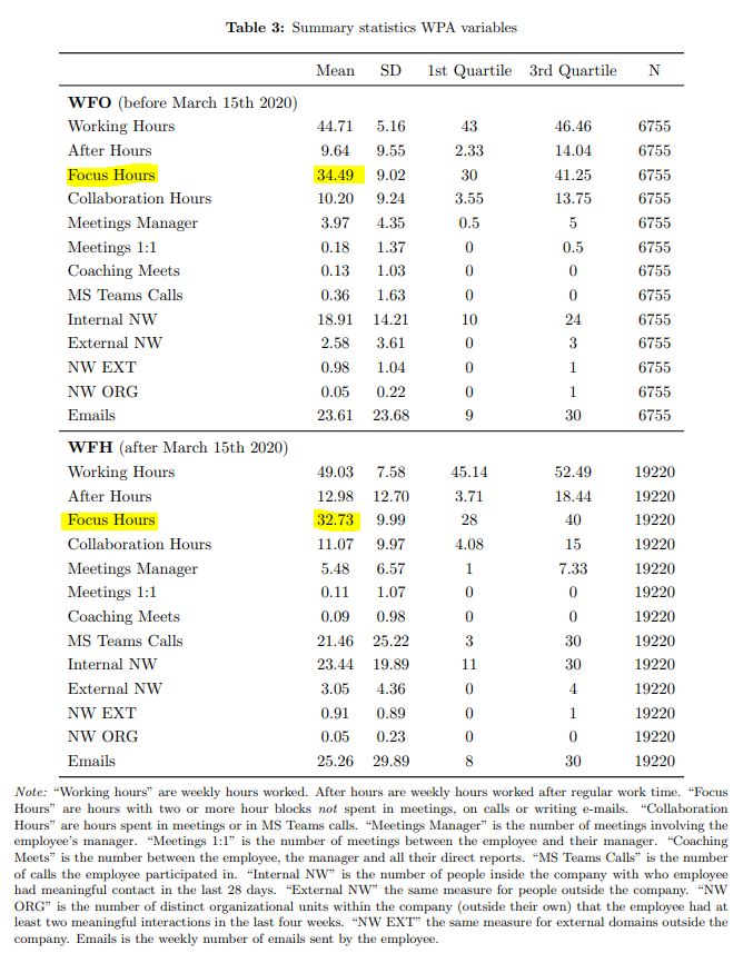 Total work output in a studied IT company was identical between WFH and office, and productivity per hour actually working ("focus time") is *higher*, but the increase in meetings by managers to check on employees ate away more than all of those gains 🤔https://bfi.uchicago.edu/wp-content/uploads/2021/05/BFI_WP_2021-56.pdf …pic.twitter.com/RCRy2OEB1m