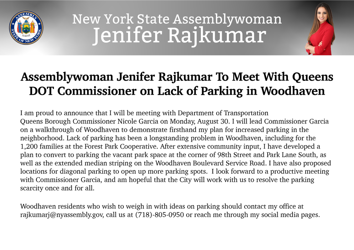 I will be meeting Monday morning with Queens DOT Commissioner Nicole Garcia on the lack of parking in Woodhaven. I have developed a plan to open more parking spaces. I look forward to a productive meeting with the Commissioner.👇pic.twitter.com/CJuII1wsNB