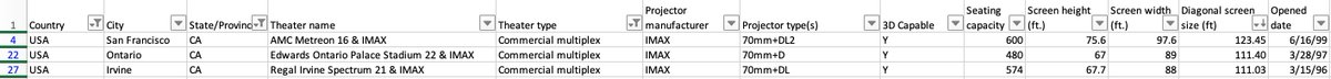 I wanted to know which IMAX was the best to see DUNE, so I scraped a theater db to see where I could get the best screening experience It turns out there's huge variance in screen size, IMAX's primary selling point! In fact, many are no larger than a standard theater #LieMAXpic.twitter.com/ye86ZCXWCf