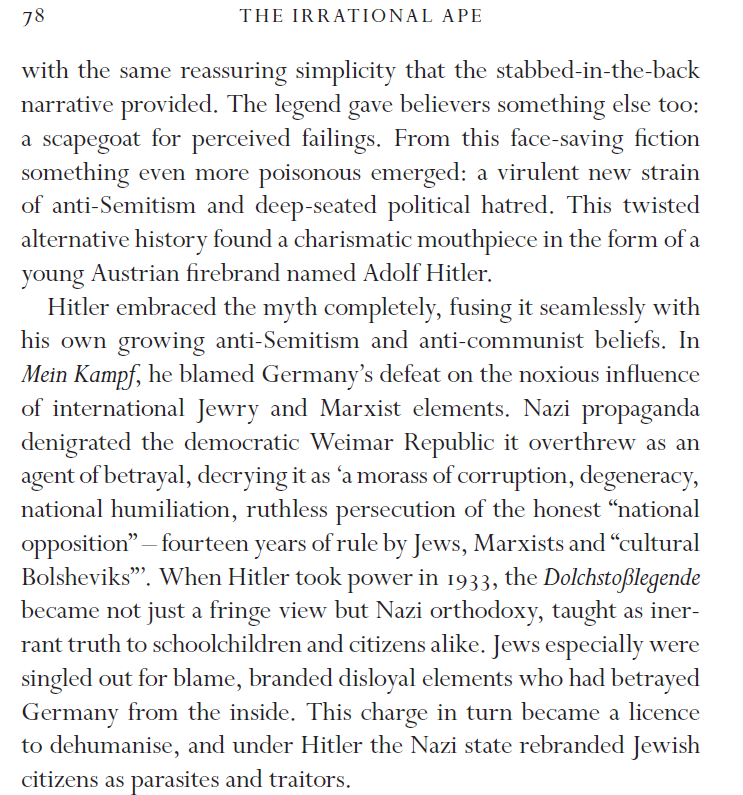..after defeat of Germany in the first world war, the far right contingent looked for a scapegoat. Thus was born the Dolchstoßlegende, the stab-in-the-back-myth. As I explain in my book #TheIrrationalApe, Jews were again demonised by Nazi orthodoxy (6/8)pic.twitter.com/r5KRk5ZfKi