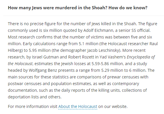 What's wrong with me? Could ask you same question. The precise numbers are unknown. It's somewhere between about 5.1 - 6 million, and that's from @yadvashem whom you've tagged in. No matter what, it's a horrific figure. https://www.yadvashem.org/archive/hall-of-names/database/faq.html …pic.twitter.com/S6jIXgeZXZ