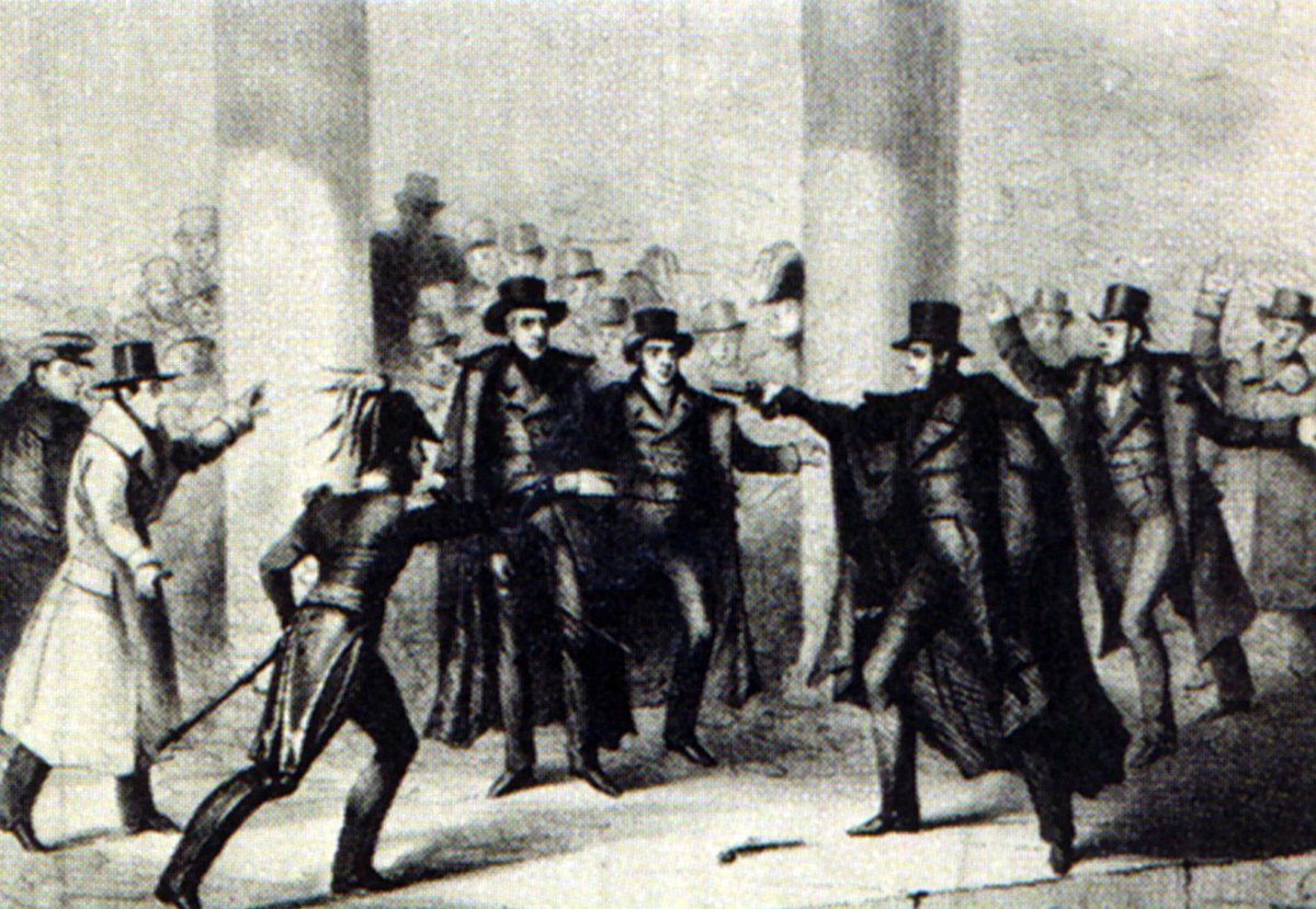 1835: Richard Lawrence, ein psychisch Kranker, versucht den US-Präsidenten Andrew Jackson zu erschießen. Als seine Pistolen fehlzünden, stürzt sich Jackson auf ihn und verprügelt den Attentäter mit dem Gehstock.pic.twitter.com/FLvT7zZvZj