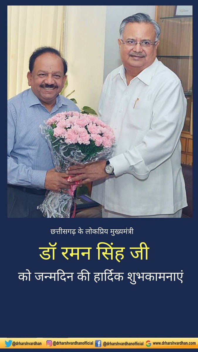 जीवेत शरदः शतम् छत्तीसगढ़ को विकास की नयी ऊंचाइयों पर ले जाने वाले लोकप्रिय मुख्यमंत्री @drramansingh जी को जन्मदिन की हार्दिक शुभकामनाएं।आपके फैसलों से #छत्तीसगढ़ के गाँव, गरीब, किसानों के मन में उज्ज्वल #भविष्य की उम्मीदें जगी हैं।@BJP4Chattisgarh @bjp4indiapic.twitter.com/fXyVkTfl9c