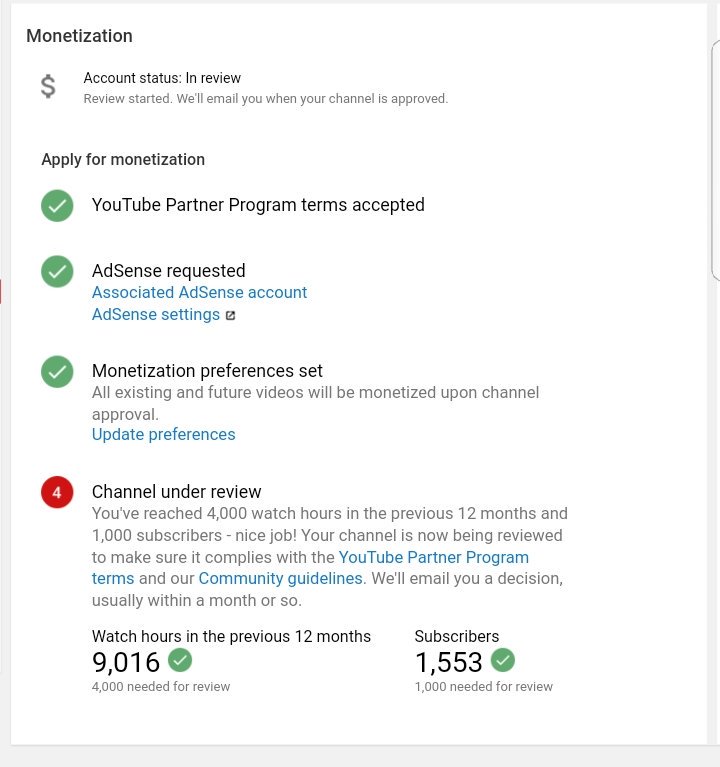 Thanks for sharing the screenshot. If you haven't heard back yet, this means our review team has not come to a clear decision during the initial review and are reviewing your channel multiple times before making a final decision. Hope you hear back soon.