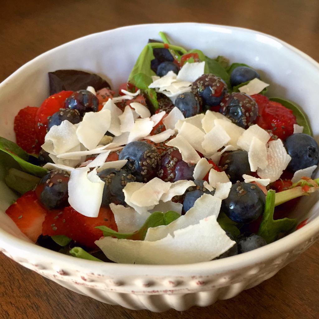 Had a yummy spinach salad with strawberries, blueberries, shredded coconut, & chia seed.