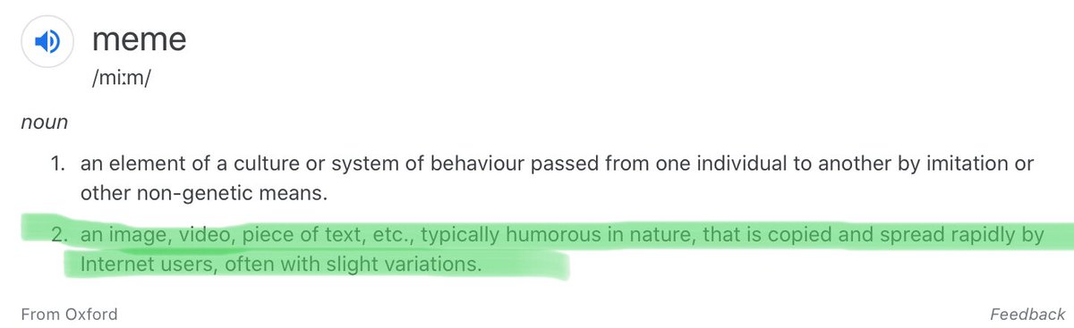 i must clarify that the existence of a subject being joked about is not in itself a meme. this definition refers specifically to formats of a meme, so emphasis on the "an image, video, piece of text"