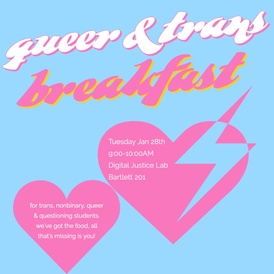 Tomorrow!! The Digital Justice Lab is hosting a "Queer and Trans Breakfast" from 9am-10am in the DJL (Bartlett 201).