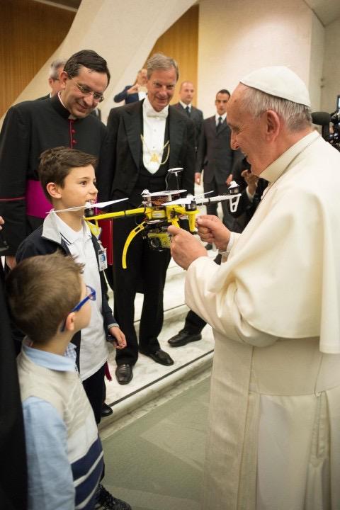 Students give drone to Pope Francis; designed in Vatican colors. http://www.washingtonpost.com/news/acts-of-faith/wp/2015/04/30/pope-francis-has-a-drone-of-his-very-own/?tid=sm_tw … via
