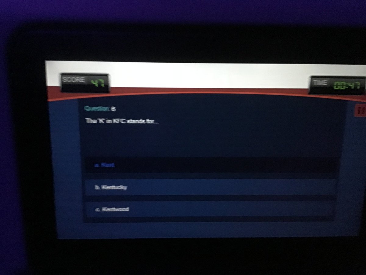 This multiplayer trivia game on the airplane was mind bogglingly bad. Score didn’t update properly?? It tallied at the end, tho that came unannounced after 10 questions. Worst of all… even after everyone answered… you still had to wait the full 60 seconds before the next roundpic.twitter.com/deMGj37EEG