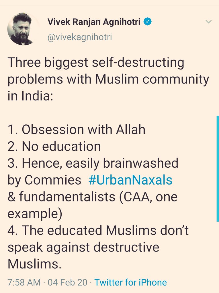 @VivekAgnihotri: 1. Islamophobia 2. Questionable education 3. Full of hate & bigotry 4. Doesn't know how to count (Note: He said "THREE biggest self-destructing problems" and wrote 4)pic.twitter.com/llvJ0CMxiS