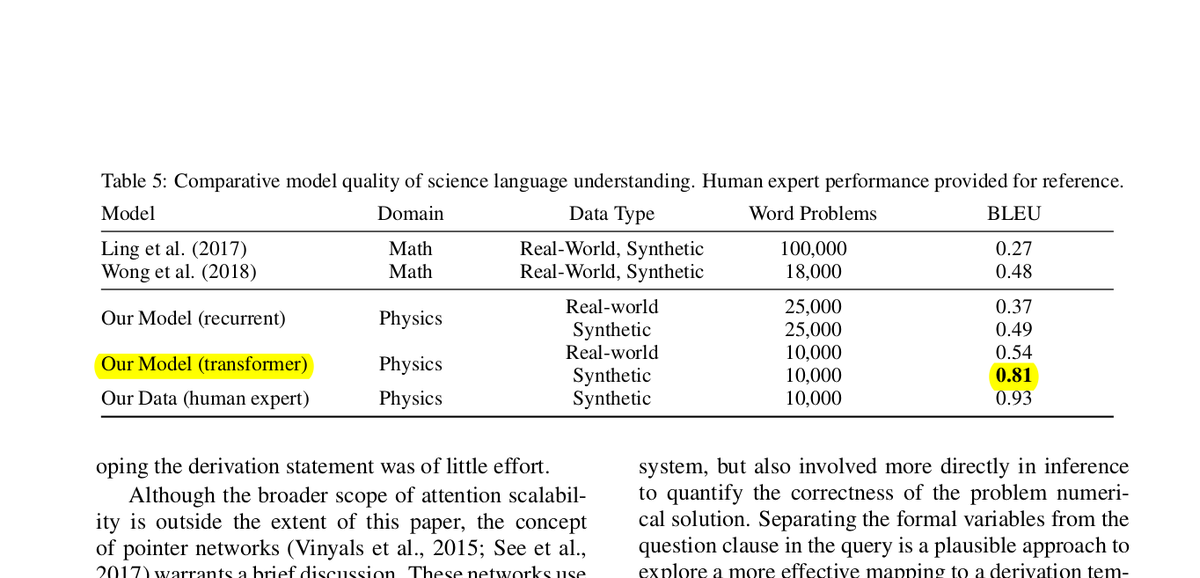 Transformers for understanding physics word problems: "Neural Sequence Modeling in Physical Language Understanding", Bleiweiss 2019: https://www.insticc.org/Primoris/Resources/PaperPdf.ashx?idPaper=80711 … "Automating tasks of generating test questions & analyzing...for assessment of written student responses..."