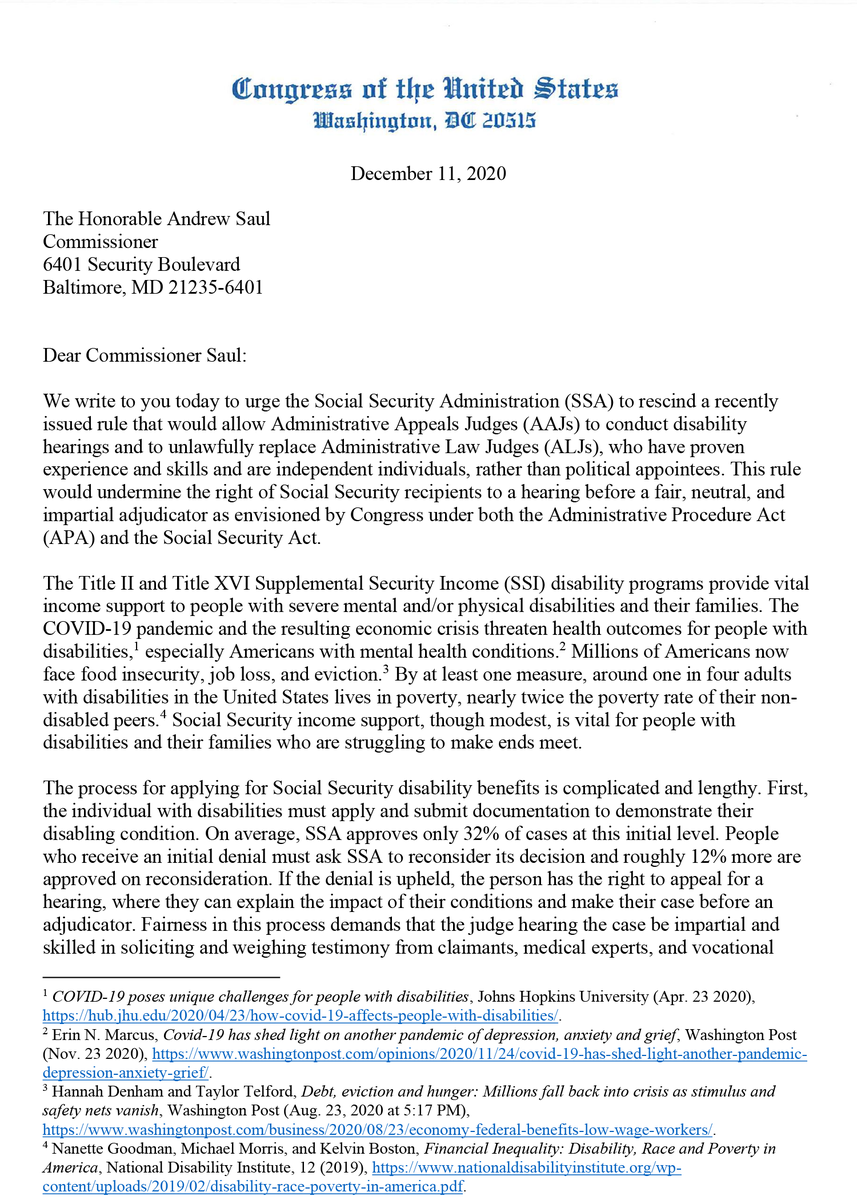 @SocialSecurity issued a new policy that would allow employees without the relevant experience to conduct disability hearings, threatening the rights of millions of Americans to a fair trial.@RepMGS and I are demanding this be reversed immediately