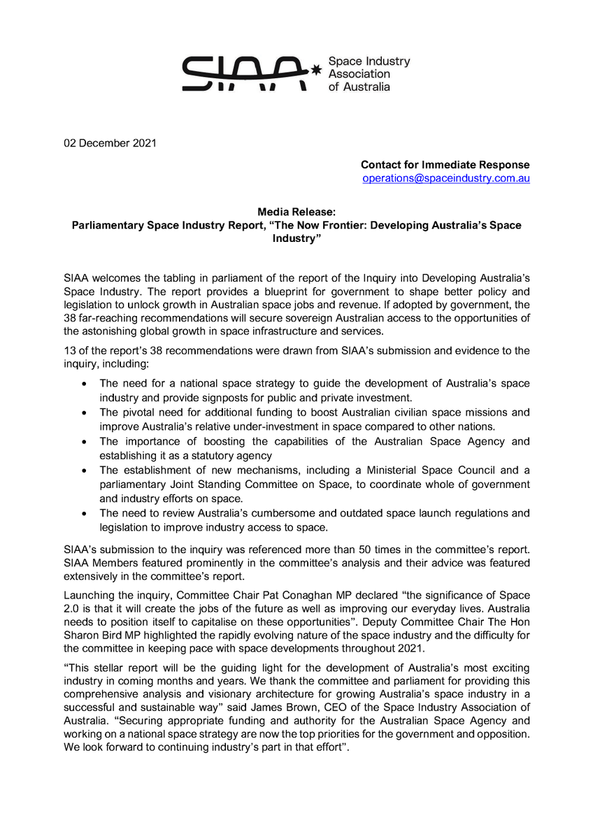 SIAA Media Release: Parliamentary Space Industry Report, “The Now Frontier: Developing Australia’s Space Industry". The report can be downloaded here: https://www.aph.gov.au/Parliamentary_Business/Committees/House/Industry_Innovation_Science_and_Resources/SpaceIndustry/Report …