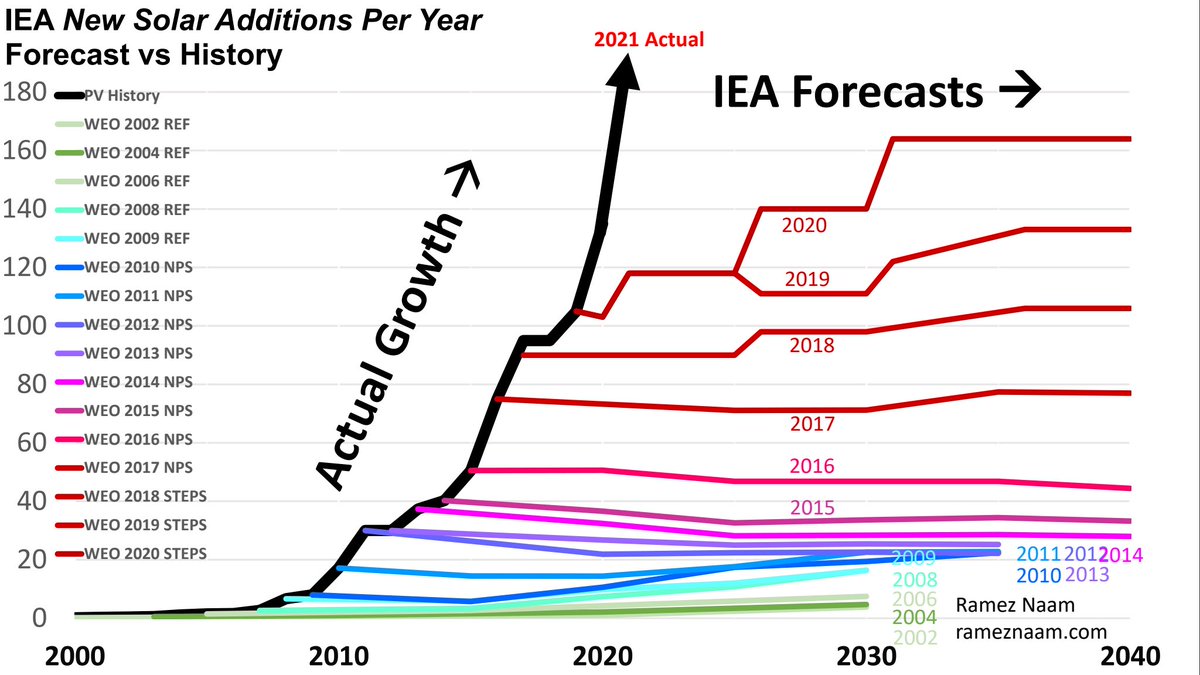 On the left: the actual growth of global solar power vs. expert forecasts. (via