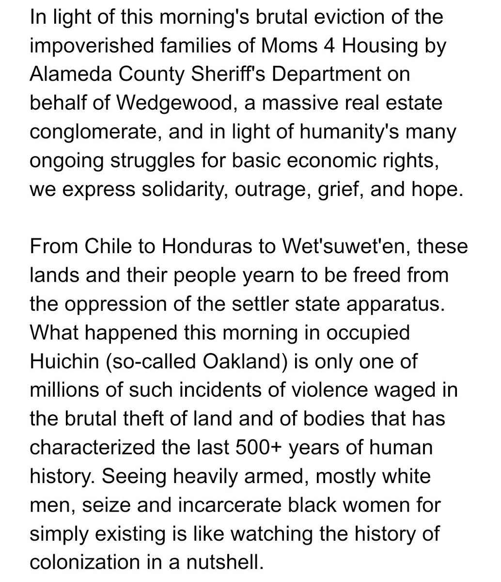 From occupied Huichin (so-called Oakland) to Wet'suwet'en the violence of the propertied class is on display against black and brown bodies, esp women. The only power we have is the power we take. Now is the time.https://twitter.com/pomegranatjewce/status/1217109142776627200 …