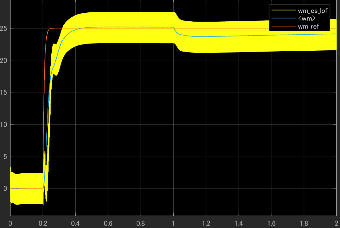 PMSMの高周波重畳センサレス制御できた!応答性の設計は速度制御器(5Hz)>PLL(20Hz)>電流制御(50Hz)>高周波(400Hz)。1秒時点でトルク外乱を発生。 「高周波電圧の振幅も設計項目である」ということに気付くまでに2週間ほどかかり完成が遅れた。pic.twitter.com/vEplW4jrYO
