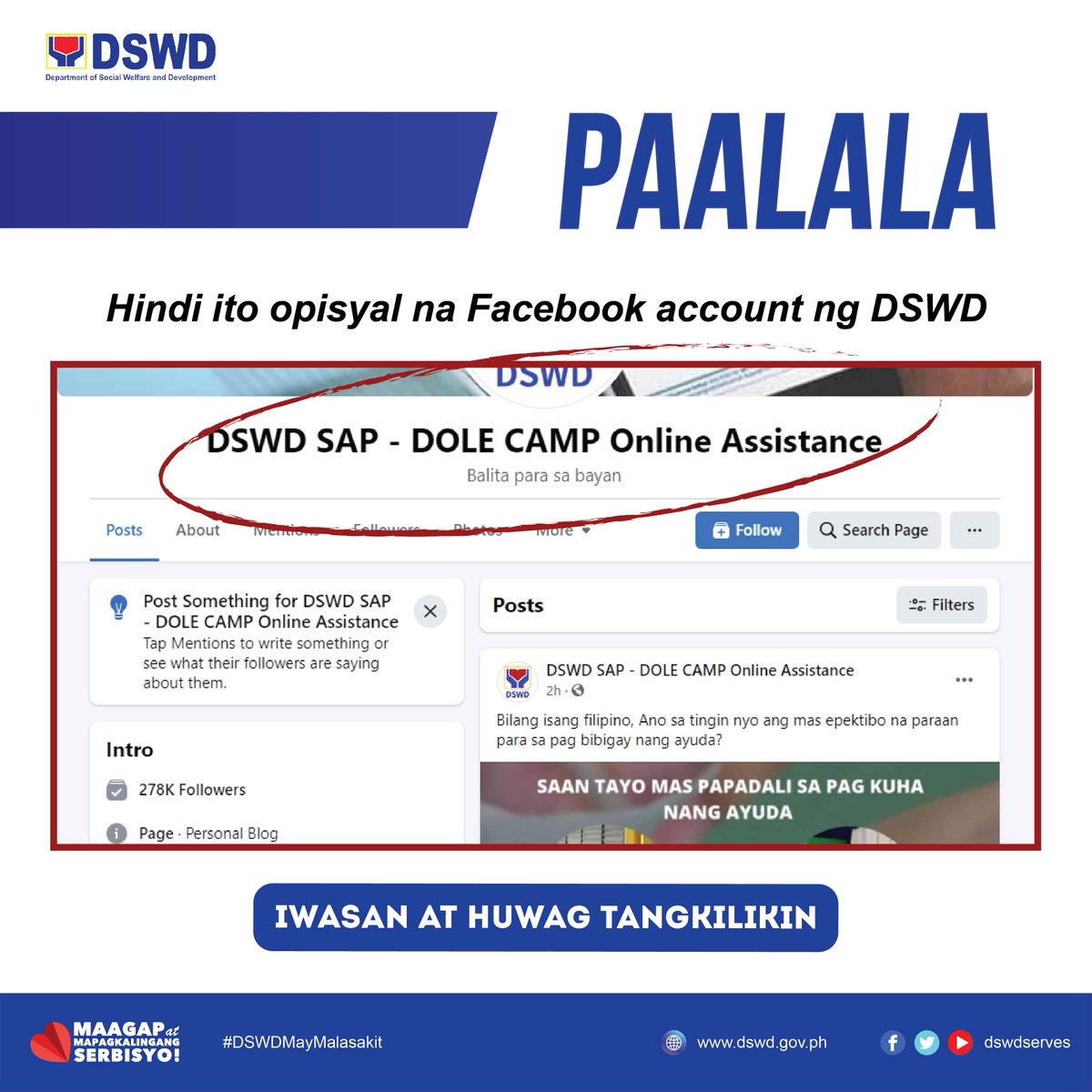 Mag-ingat sa FB pages gaya nito. Huwag tangkilikin at agarang ireport sa FB upang hindi kumalat ang mga maling impormasyon. Para sa mga programa at serbisyo ng DSWD, narito ang link ng ating mga official accounts: Facebook at Twitter: