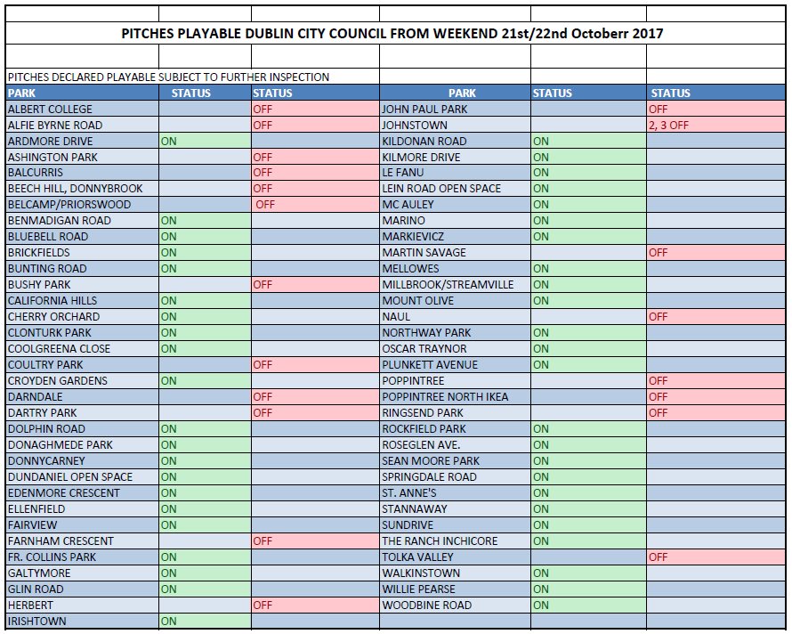 Dublin City Council Pitch Playability for Weekend 21st / 22nd October 2017 - UPDATE: Tolka Valley is OFF. http://www.dublincity.ie/sites/default/files/content/RecreationandCulture/SportsFacilities/Playfootball/Documents/pitchcall.pdf …pic.twitter.com/KRJA3FpK2v