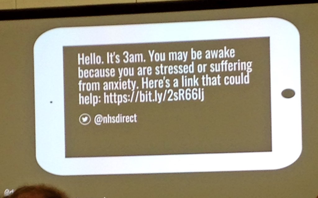 @danslee gives a shout out for an NHS Direct tweet that did it beautifully.#commsconf18@comms2point0@NHSChoices@NHSDigitalpic.twitter.com/DMecWgW7Df