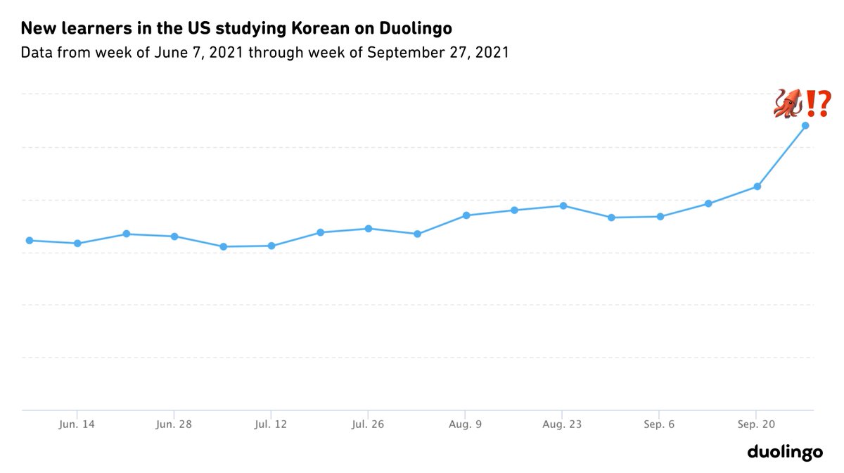 Not just you! We've seen ~40% growth in new Korean learners in the US compared to this time last year: https://blog.duolingo.com/squid-game-could-inspire-a-new-wave-of-korean-language-learners/ … https://twitter.com/OhChyLanta/status/1445240251233013765 …pic.twitter.com/taYGDQpvKj