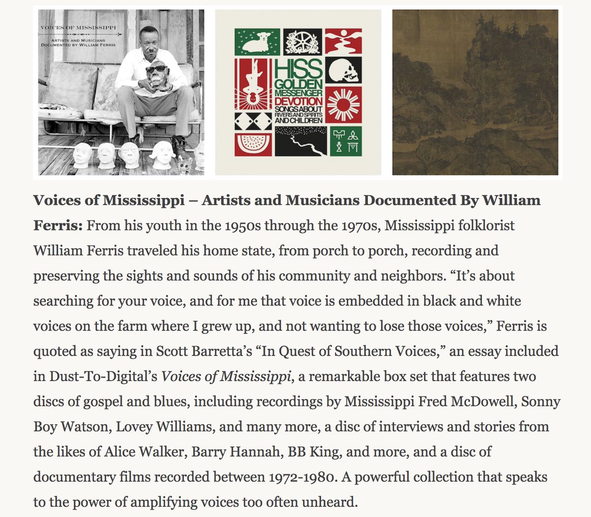 Excited to see “Voices of Mississippi” and “Listen All Around” on several Year-End Lists. Thanks to