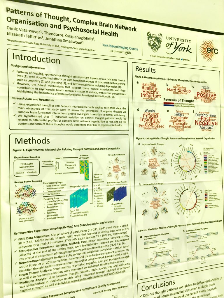 Want to know more about the link between complex brain network organisation, patterns of ongoing thought and psychosocial health? Please find me at Poster #1639 for a chat!