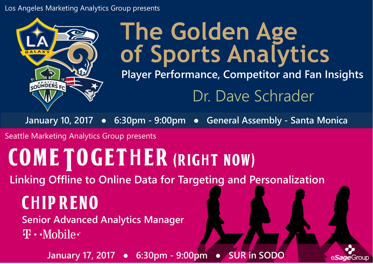 LA and Seattle Mktg Analytics Groups kicking off 2017 strong. 1st up on 1/10 Dr. Dave Schrader on sports
