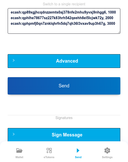 http://Cashtab.com now supports sending to multiple recipients in one transaction! This is a great companion to the token dividend tool: https://ethanmackie.github.io/eTokenDividendCalculator/ … Send eCash to holders of your eToken with Cashtab
