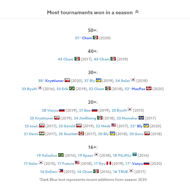 Congratulations to @eXonCham for becoming the first @StarCraft player in history to win 50 tournaments within a year!🥇👏🎉 With ~3 months left in 2020, how many more might he be able to win!?🏆🔖🌟 http://oscesports.com/hall-of-fame pic.twitter.com/NuJNHP0CgO