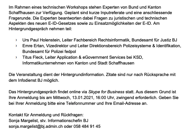 Im Rahmen des Öffentlichkeitsgesetz beantragen wir Zugang zu einer digitalen Aufnahme des BJ-Workshops (Skype). Der Workshop @EJPD_DFJP_DFGP ist ein offizieller Teil der BGEID-Abstimmungskampagne für den 7. März 2021. (2/5)pic.twitter.com/sCRLaMsWNJ