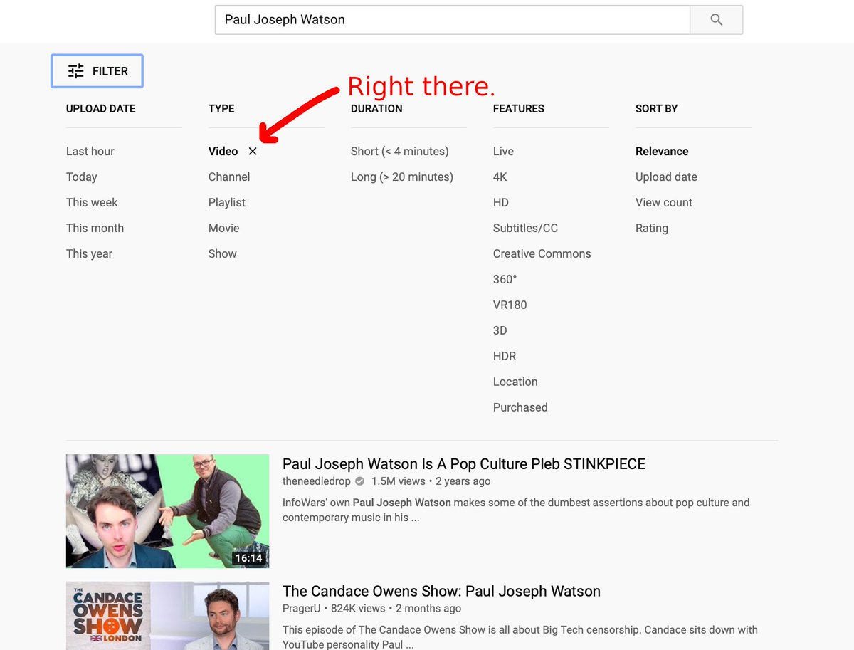As we announced last night, @TeamYouTube has begun blacklisting right-leaning, conservative, and libertarian channels from the first page of video results leading up to the 2020 Election. Another channel affected: @PrisonPlanet https://www.youtube.com/results?search_query=Paul+Joseph+Watson&sp=EgIQAQ%253D%253D …pic.twitter.com/068LDcyrpT