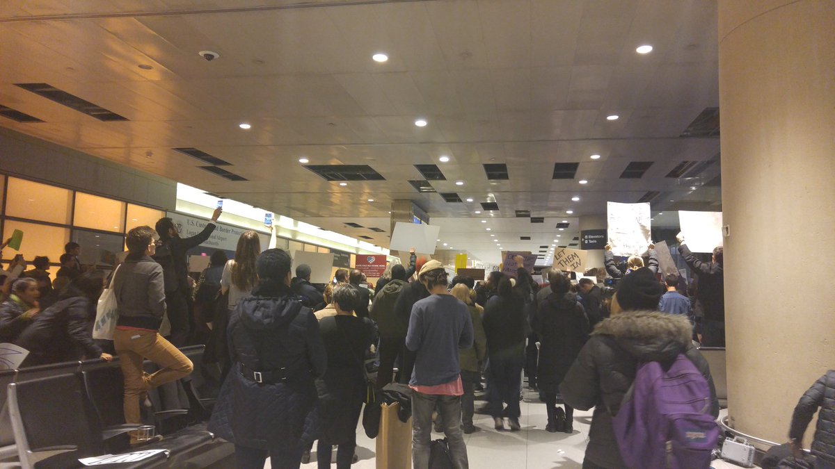 A view from the far side of the crowd, behind the press covering the protest at Logan #MuslimBanprotestpic.twitter.com/SRkeawLSoC