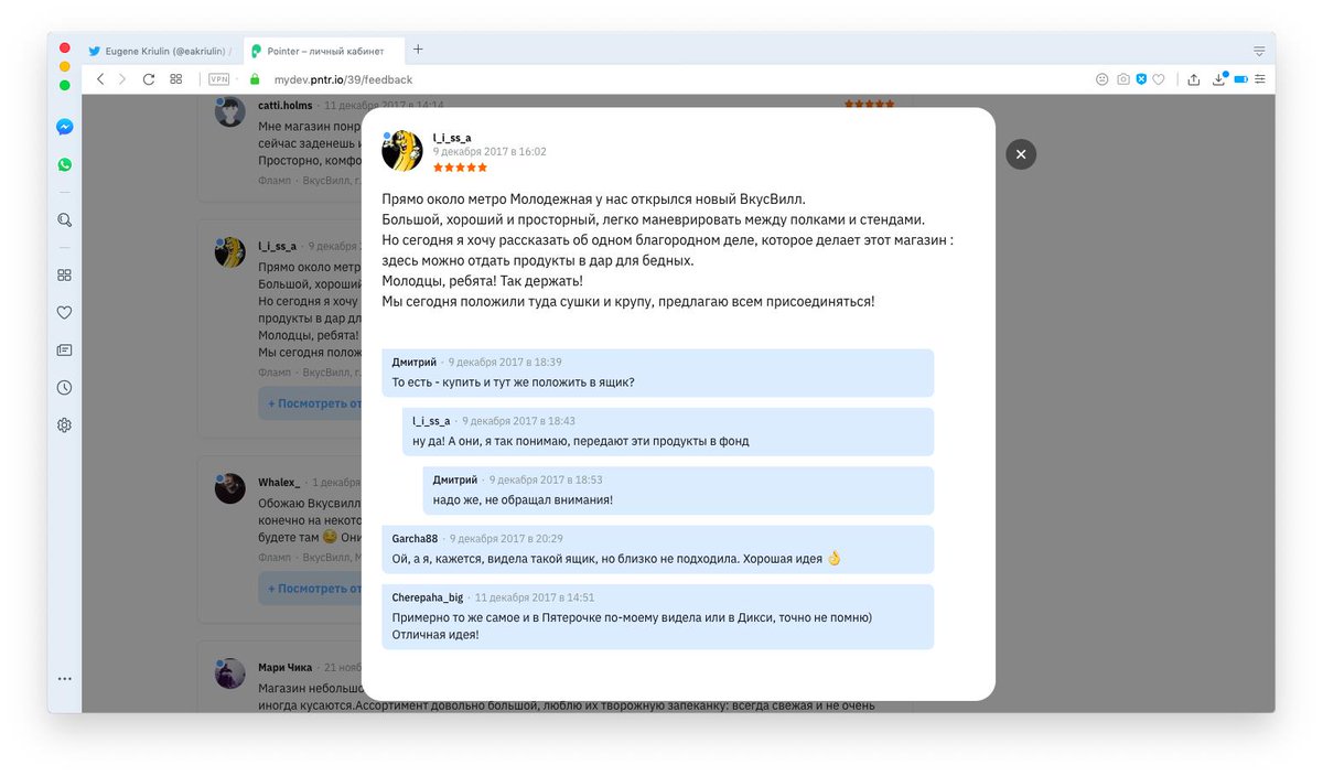 Как Node.js разработчик, я являюсь частью команды, которая делает http://pntr.io . Впервые проектировал MySQL таблицу с древовидной структурой данных для работы с отзывами и комментариями. Использовал nested sets. Запросы к БД красивые. Приятно видеть, что все работает