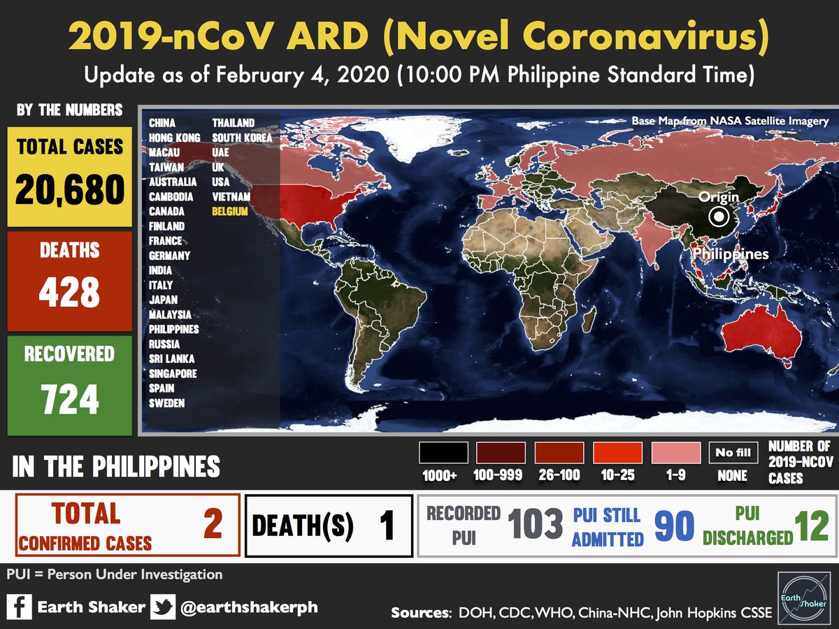 2019-nCoV ARD UPDATE (Feb 4): The total cases worldwide already climbed to more than 20,000 as of today, with Belgium being the latest country with a confirmed case. Here in the Philippines, the CONFIRMED remained at 2, but the PUIs increased.pic.twitter.com/9FkMHfKYF7