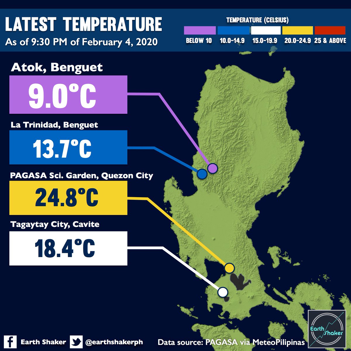 Lowest Recorded Temperature (Morning of February 5, 2020) The persistence of the northeast monsoon (amihan) continues to induce cold morning across the country, but today's generally warmer than yesterday.pic.twitter.com/XduP0McDfw