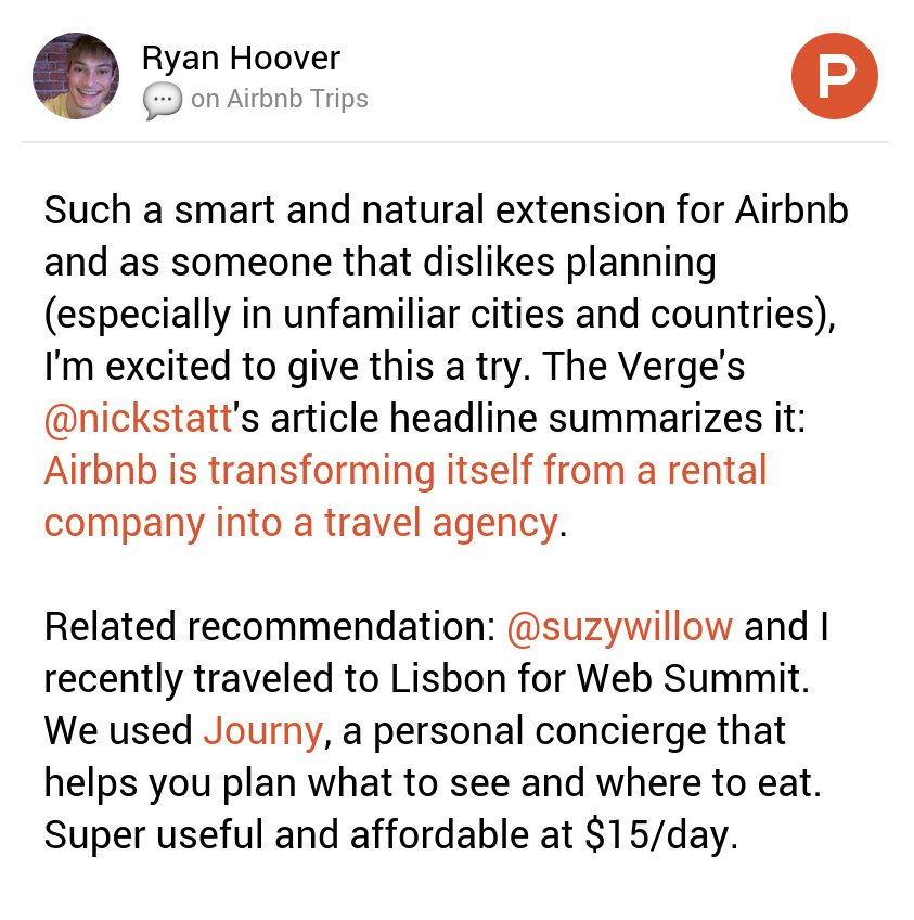@rrhoover's thoughts on Airbnb Trips on@ProductHunt cc@nickstatt@suzywillow https://www.producthunt.com/posts/airbnb-trips#comment-390072 …pic.twitter.com/s9ciXnn3Z5