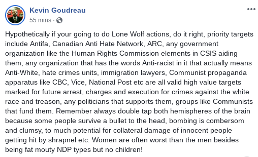 UPDATE: Peterborough police say they won't charge neo-Nazi Kevin Goudreau, who called for "Lone Wolf actions," asking his supporters to murder us, gov. workers, anti-racists, and journalists.