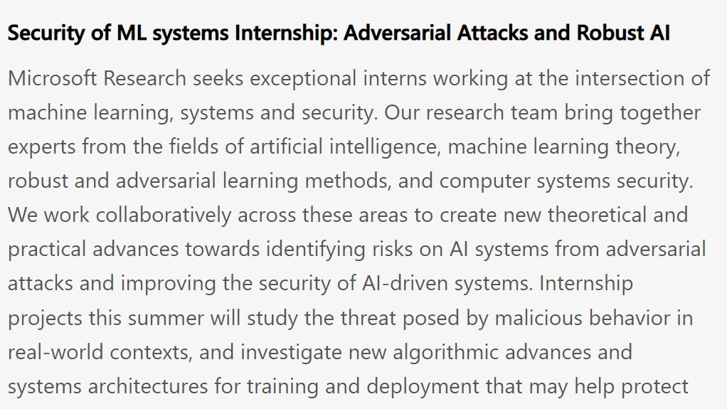 We are looking for interns who are excited about exploring the intersection of ML and security on real-world systems. Please apply through the link: https://careers.microsoft.com/us/en/job/764937/Research-Intern-Security-of-Machine-Learning-Systems …