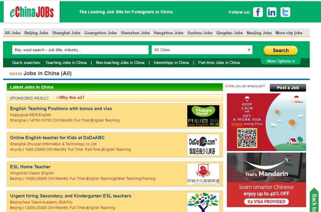 Now for some teaching jobs! For more like this visit http://jobs.echinacities.com English Teacher 10-14,000 CNY/month http://jobs.echinacities.com/jobchapter/1354548099 …