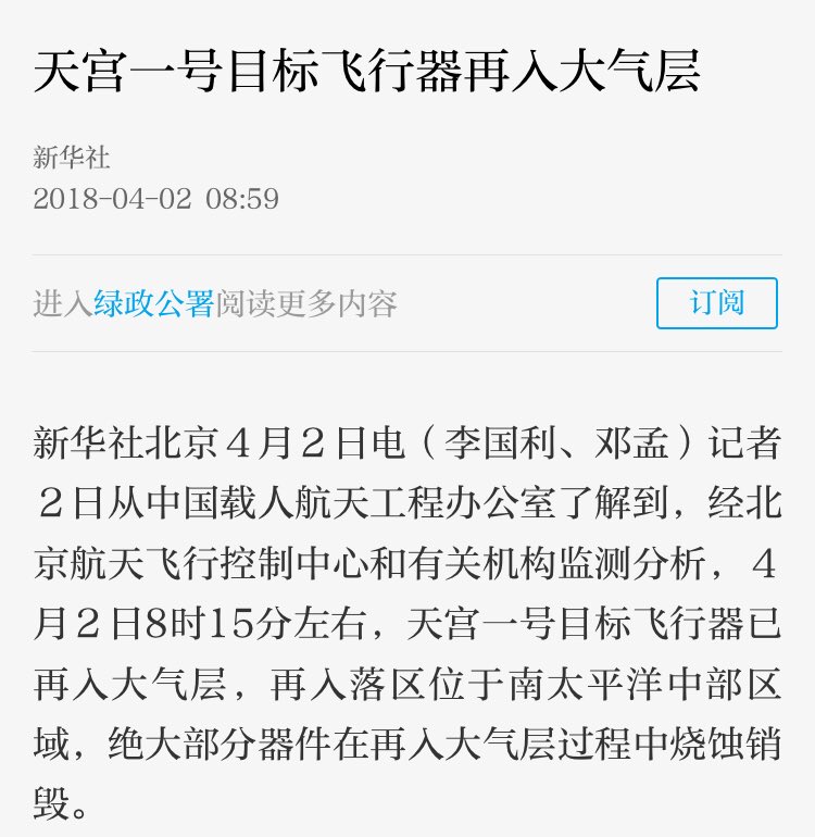 #Tiangong1 re-entered the atmosphere to the central area of southern Pacific around 8:15 am today. Most of it burned during the fall.pic.twitter.com/qD0cic9mFE