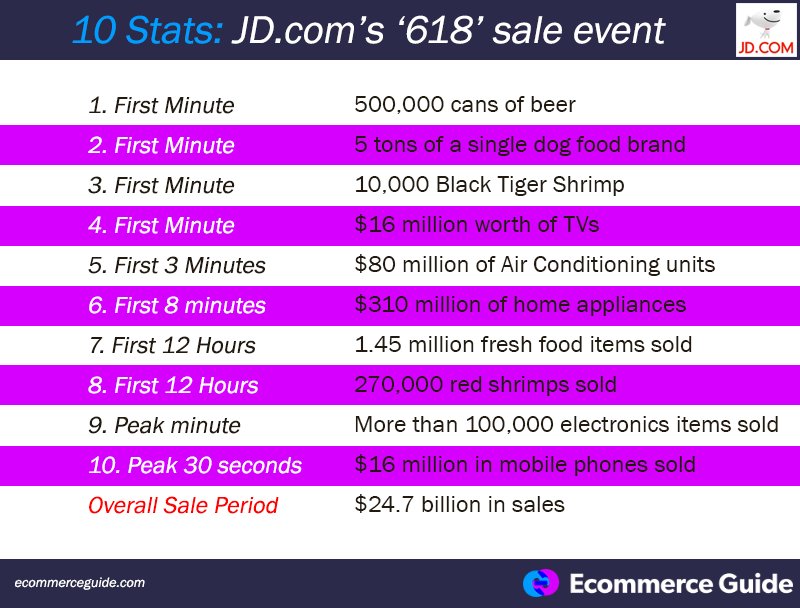We've compiled the stats from http://JD.com 's "618" sale event. They sold *500,000* cans of beer, and *$16 million* of TVs in the first minute of June 18th. That + 10 other shocking ecommerce stats here:pic.twitter.com/mBjdJYq7aj