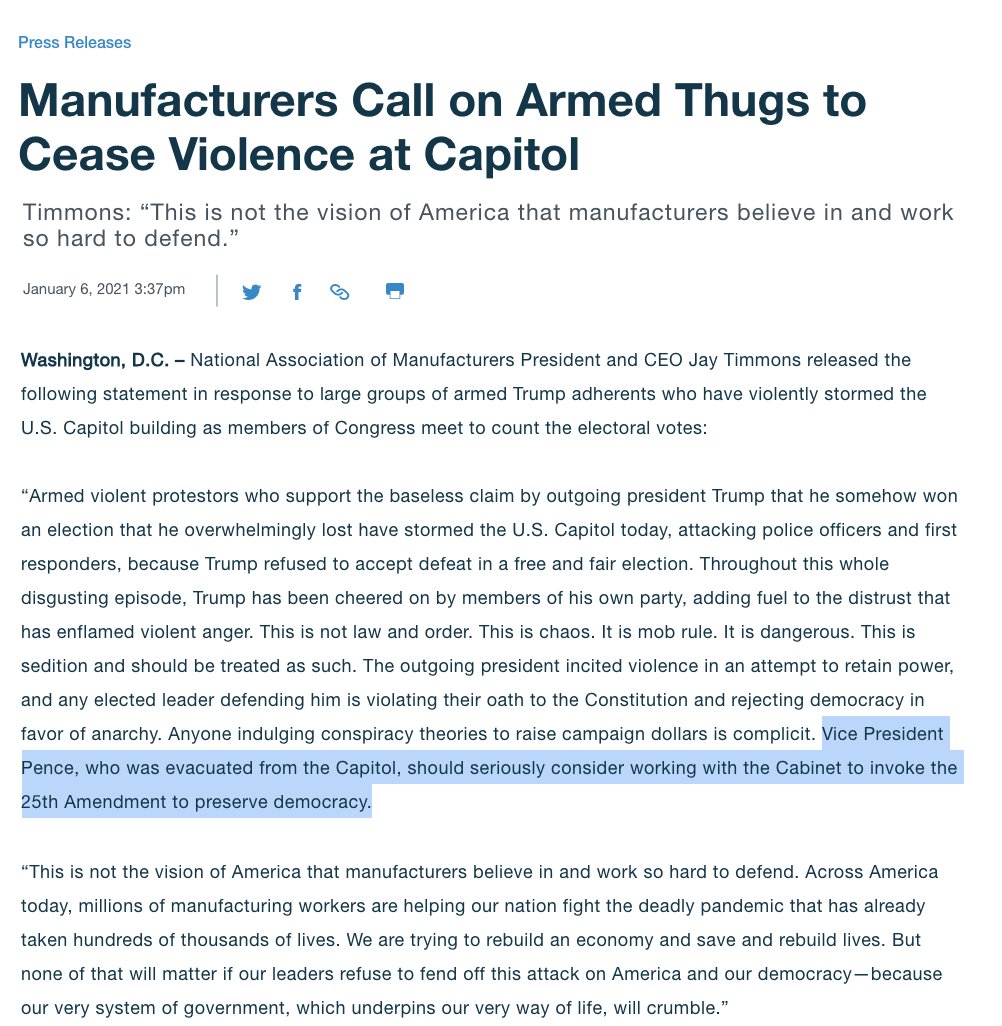 National Association of Manufacturers calls on Pence and Cabinet to consider invoking the 25th Amendment to preserve democracy https://www.nam.org/manufacturers-call-on-armed-thugs-to-cease-violence-at-capitol-11628/ …pic.twitter.com/BOftXkC1ET