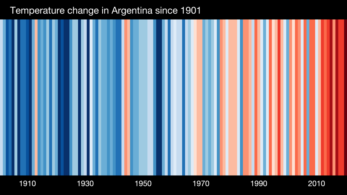 Estas barras representan los cambios de temperatura en Argentina desde 1901 hasta 2020. Los azules más fríos y los rojos más cálidos. Es evidente que la tendencia es hacia años más cálidos y cada vez son más cálidos. Y esta tendencia es global. #CambioClimatico #ShowYourStripes pic.twitter.com/epia5c6Wfi