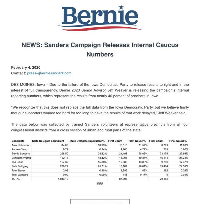 We can confirm the final results of the unreleased Iowa Poll: Sanders 22% Warren 18% Buttigieg 16% Biden 13%https://fivethirtyeight.com/live-blog/iowa-caucus-2020-election-live/254963/ …