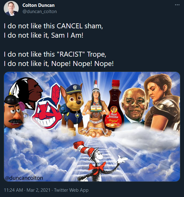 So is it "cancel culture" if it's yourself or your people doing it? You still have the Lorax and the Grinch. Cat in the Hat isn't going anywhere. Nobody is going to mourn the loss of McElligot’s Pool.