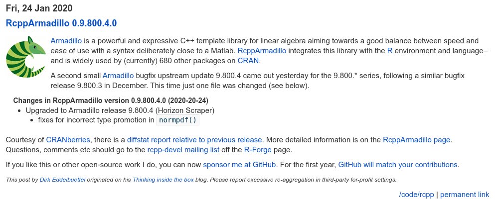 RcppArmaillo 0.9.800.4.0 on CRAN: Small upstream fix R bindings to powerful and expressive C++ matrix library http://dirk.eddelbuettel.com/blog/2020/01/24#rcpparmadillo_0.9.800.4.0 …