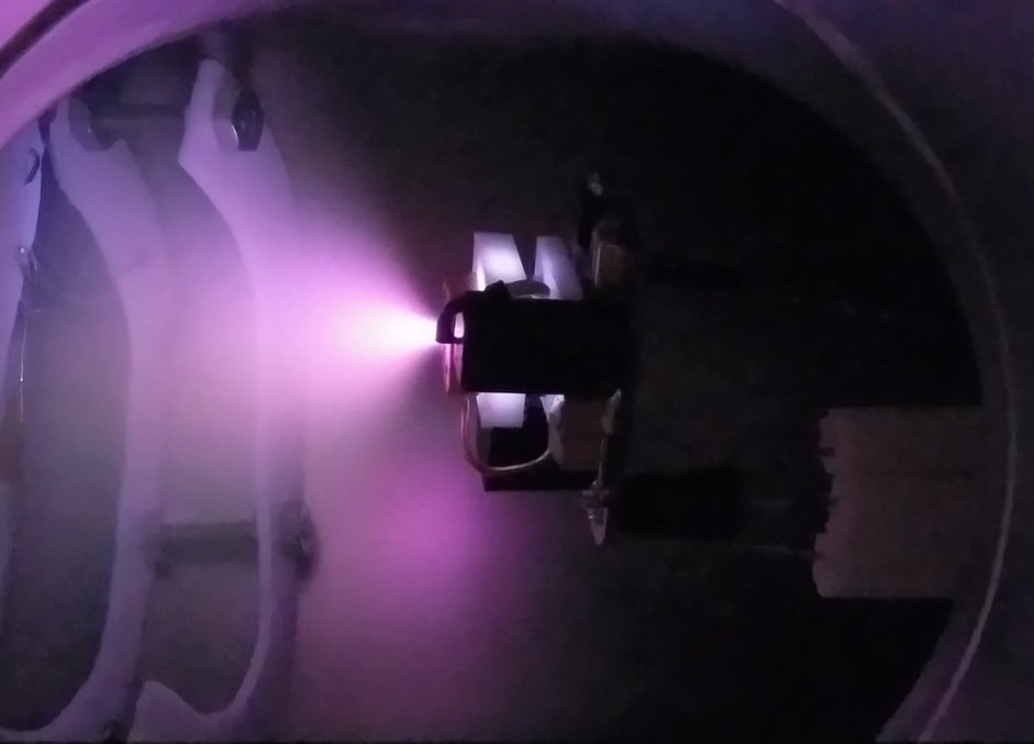 Stunning capture of the plasma plume from the AIS-gPPT3-1C-T propulsion module, the first officially available and open source thruster for PocketQubes! Beautiful pinkish-purple jet blasting out, illuminating the Teflon fuel from within against the black outline of the board.pic.twitter.com/wD8sghfeJ5
